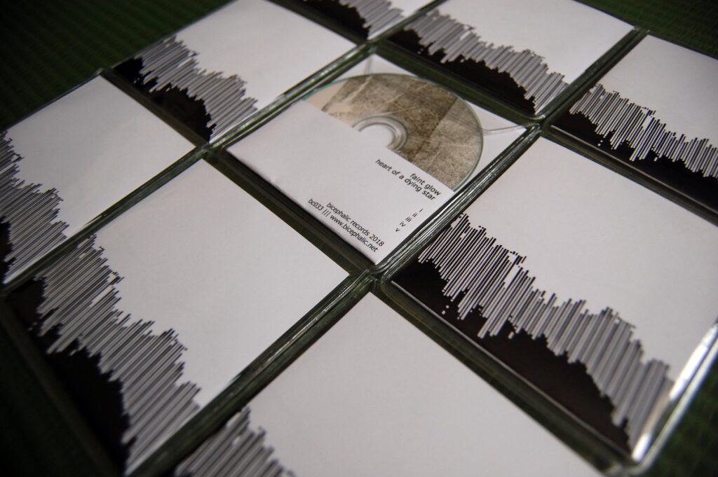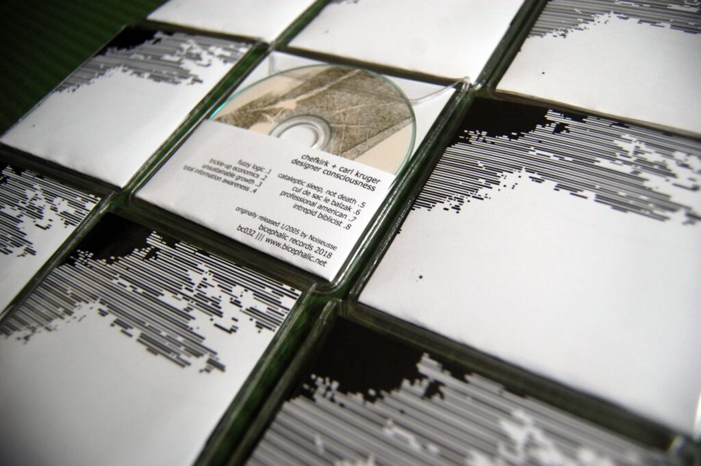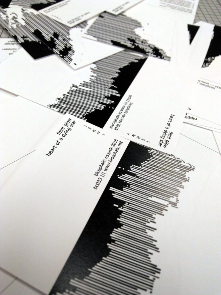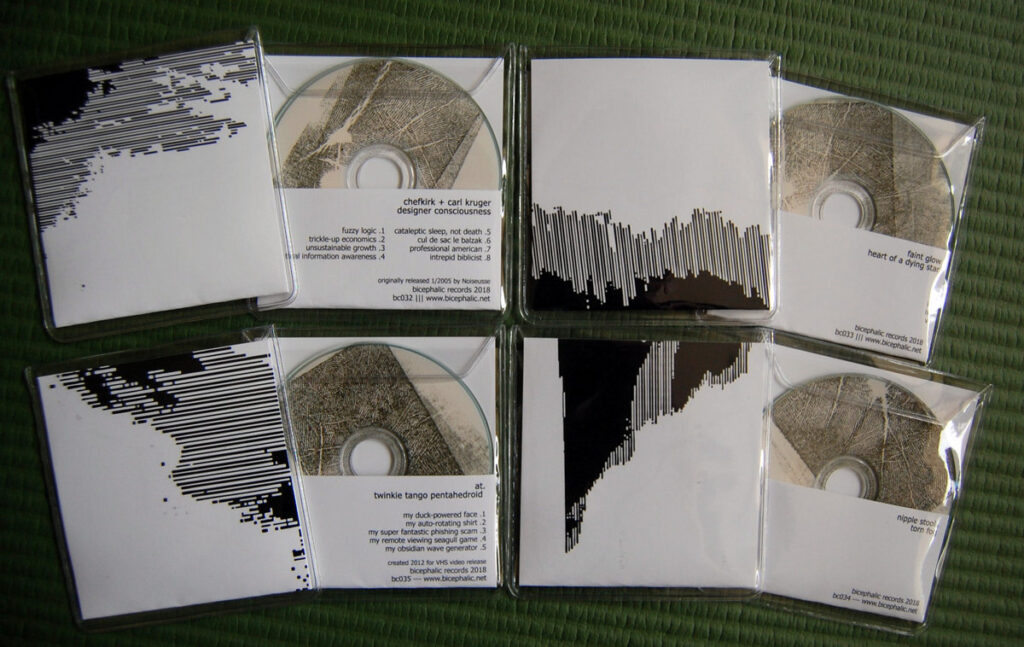 This batch of four 3-inch mini cds was created for Bicephalic Records for their summer 2018 releases. Each cd has black and white glitched geometric artwork printed on cardstock and hand-inked cds.