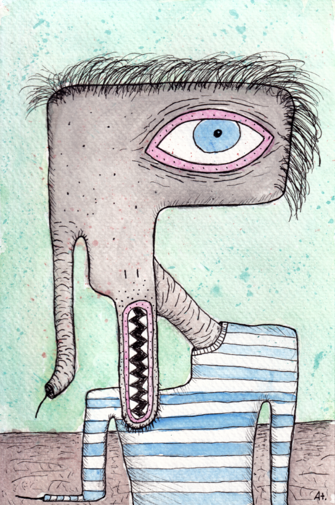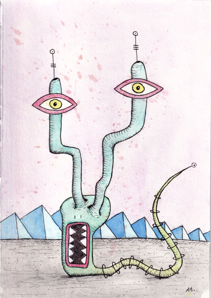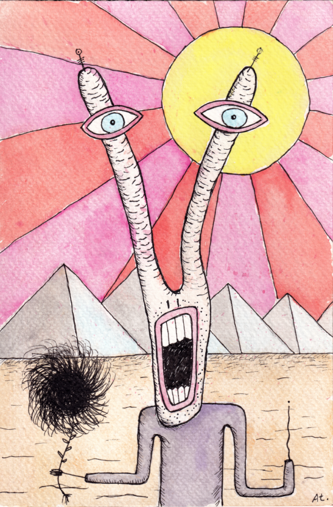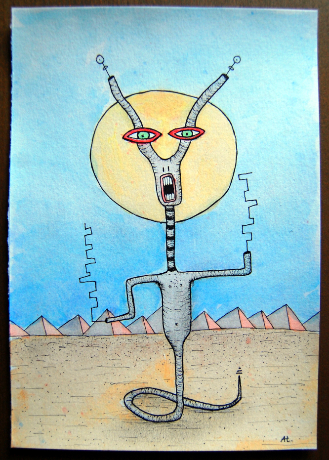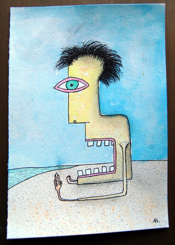 This is a series of watercolor and ink paintings I made 2023-2024 while traveling full time. Self portraits mixed with snapshot images of extraterrestrial vacationers to planet Earth.